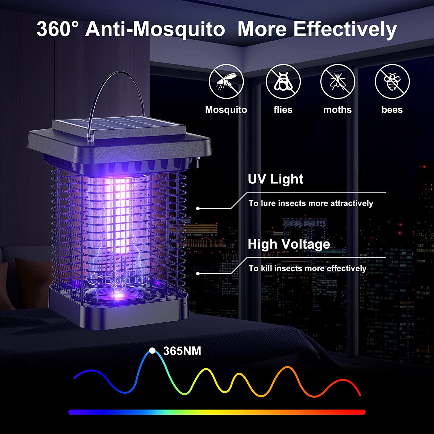 • 【Powerful and Efficient Mosquito Killer】 The bug zapper uses the thermal effect to simulate human body temperature in a wide range of 360°, and then releases ultraviolet light with a wavelength of 365NM and 4200V electric shock to attract mosquitoes, flies, moths, and other insects.